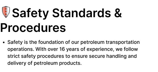 Safety is the foundation of our petroleum transportation operations. With over 16 years of experience, we follow strict safety procedures to ensure secure handling and delivery of petroleum products.